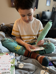 Aiden loves dinosaurs. Dinosaurs have been his special interest since he was a baby. Aiden was speech delayed and didn't talk until he was 3. Prior to that he mastered dinosaurs sounds and I have videos of him sounding like a T. rex! He has tons of dinosaurs at home and knows a bunch of facts that always surprise his family!