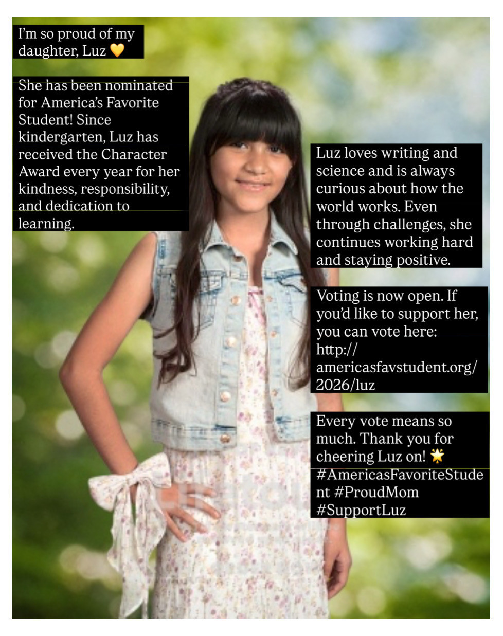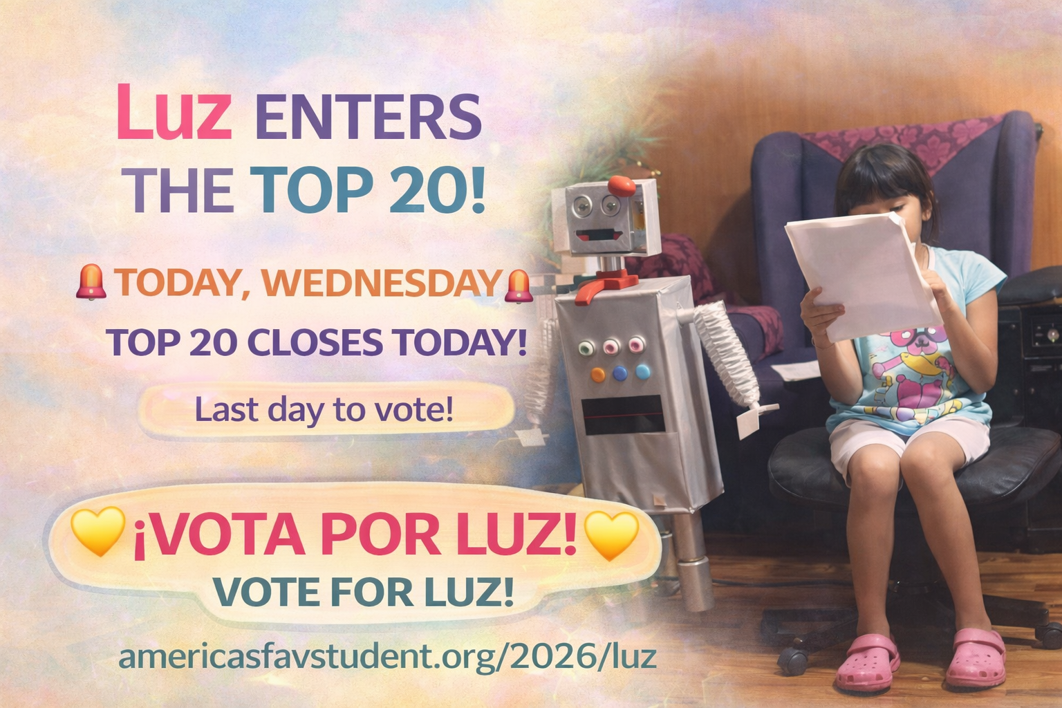 Help Luz become America's Favorite Student by casting your free daily vote, or make an even bigger impact when you vote by donation, supporting The Planetary Society and their mission to inspire curiosity and help shape the future of space exploration for everyone.